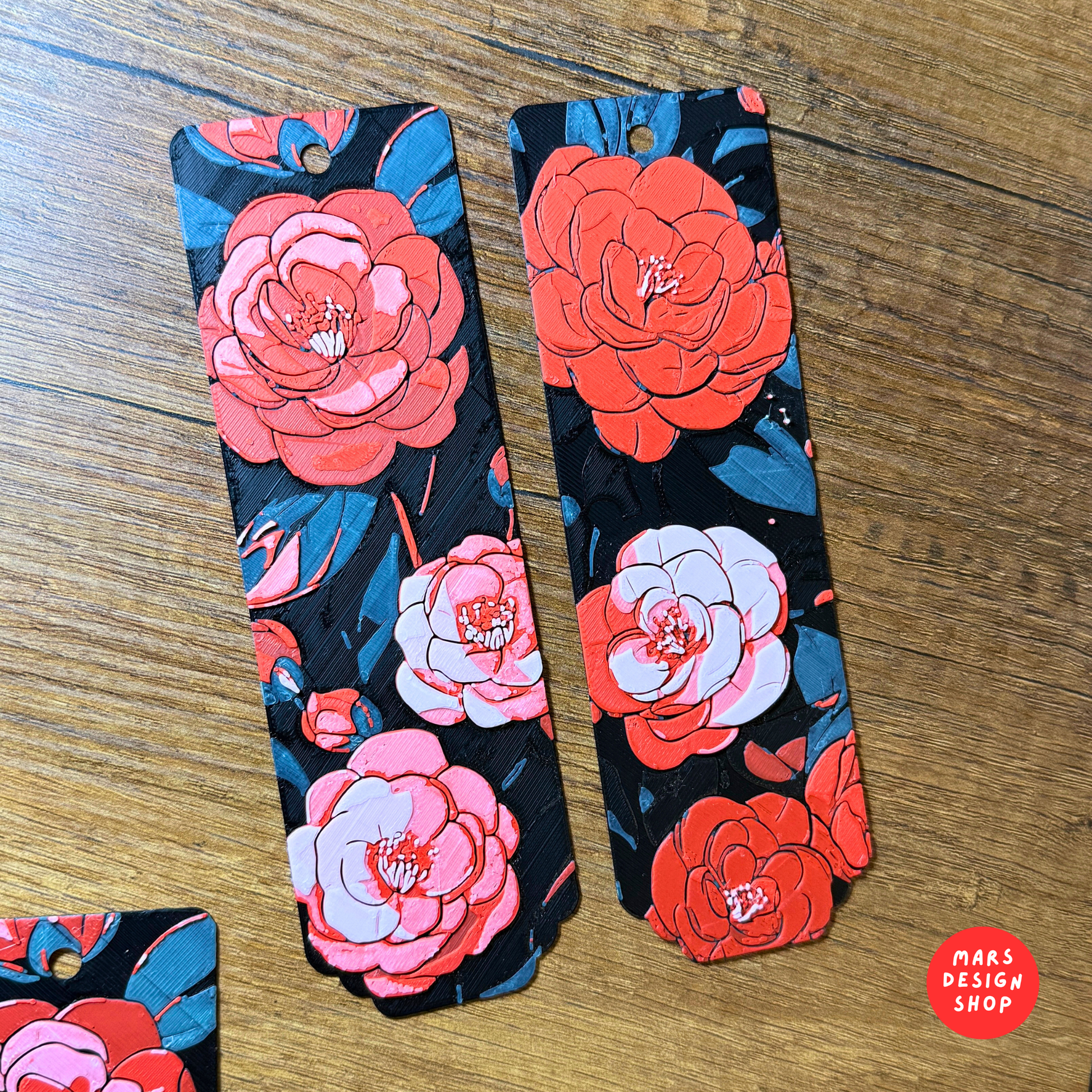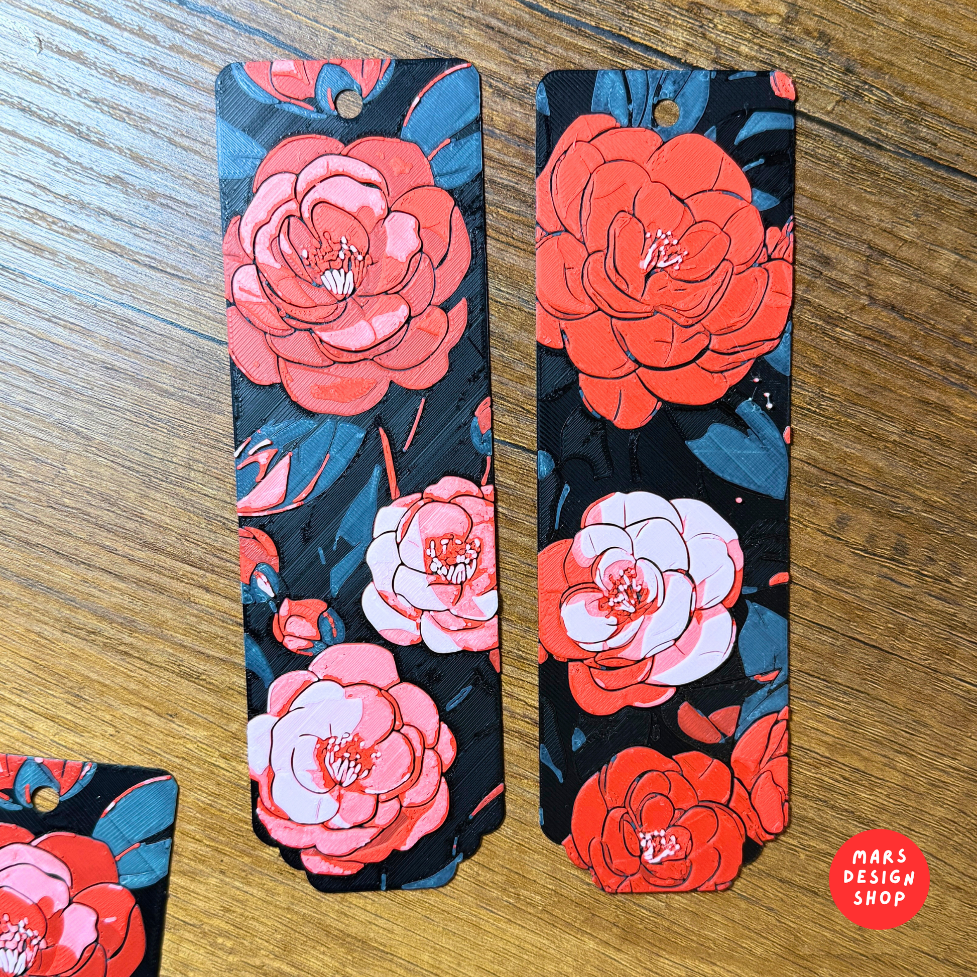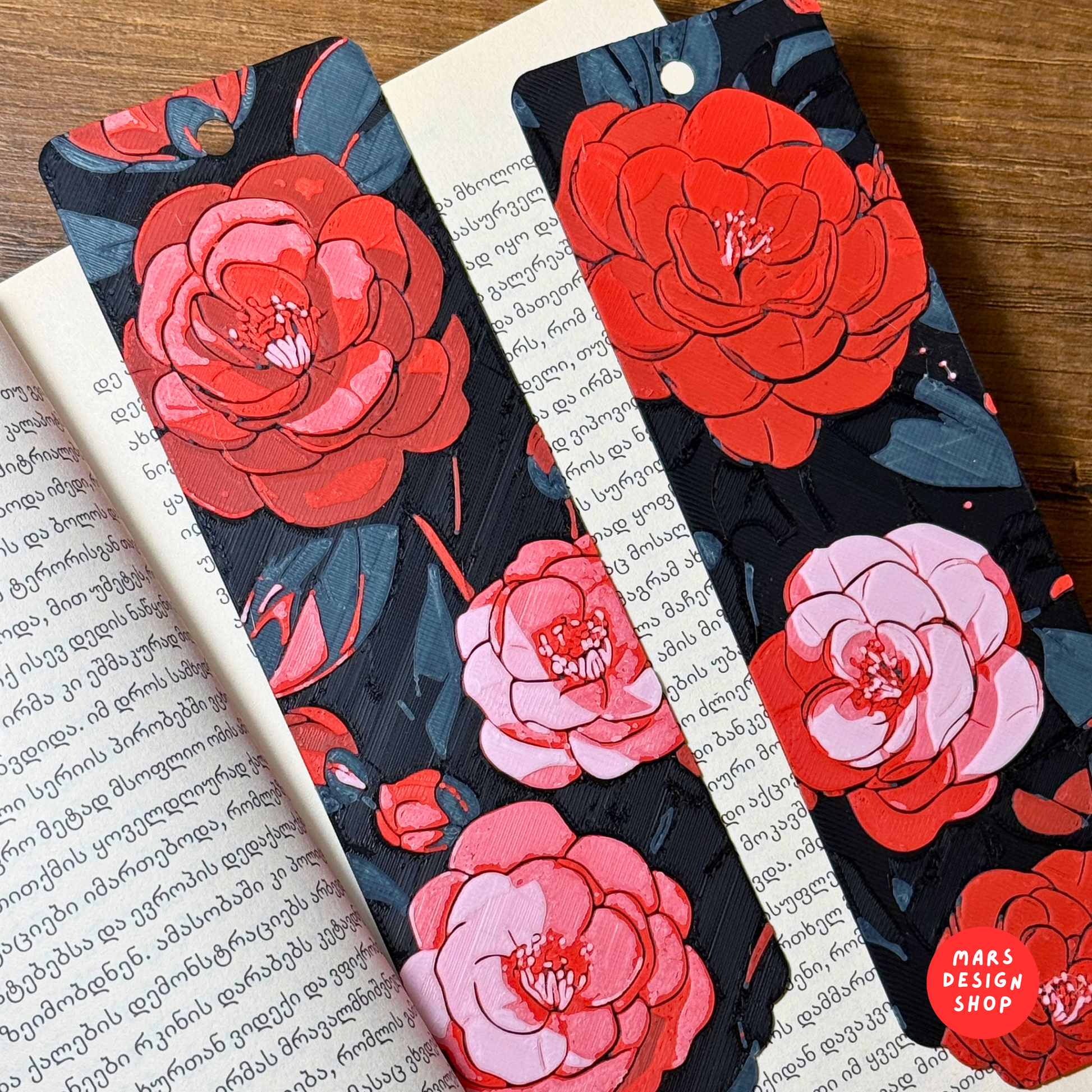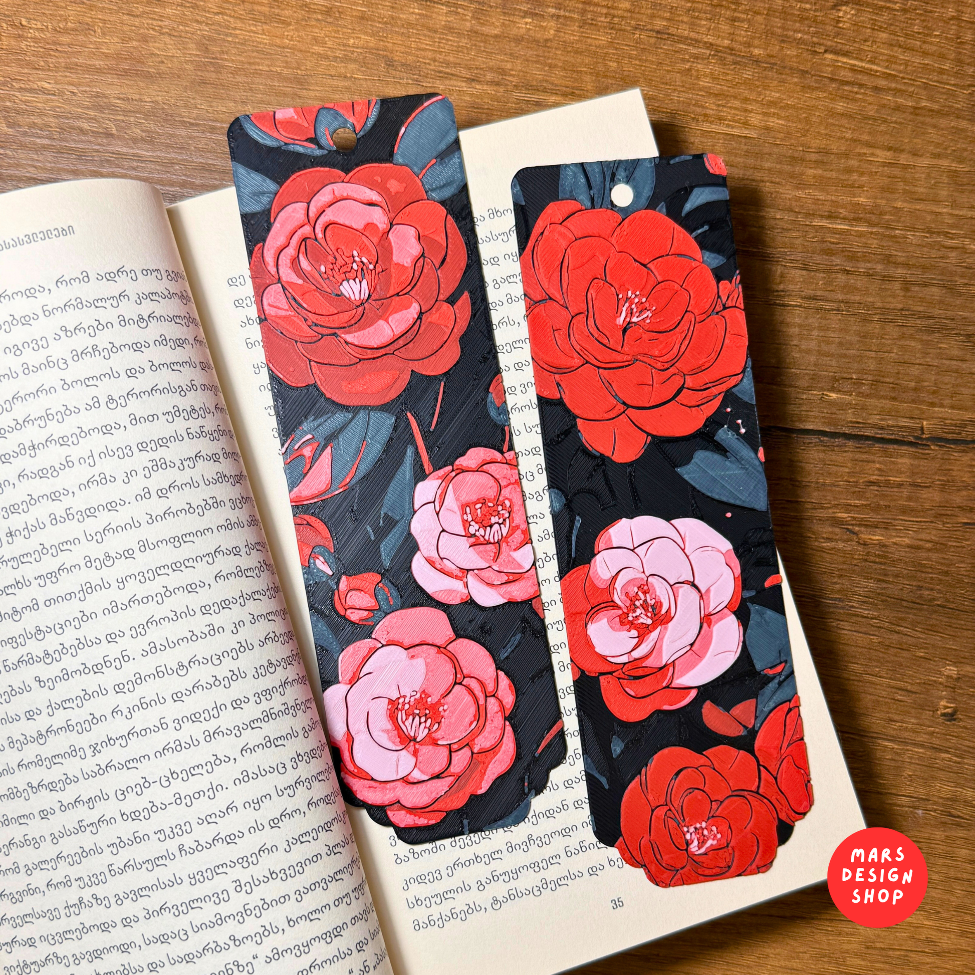 3D დაბეჭდილი წიგნის სანიშნეები წითელი ყვავილების გამოსახულებით